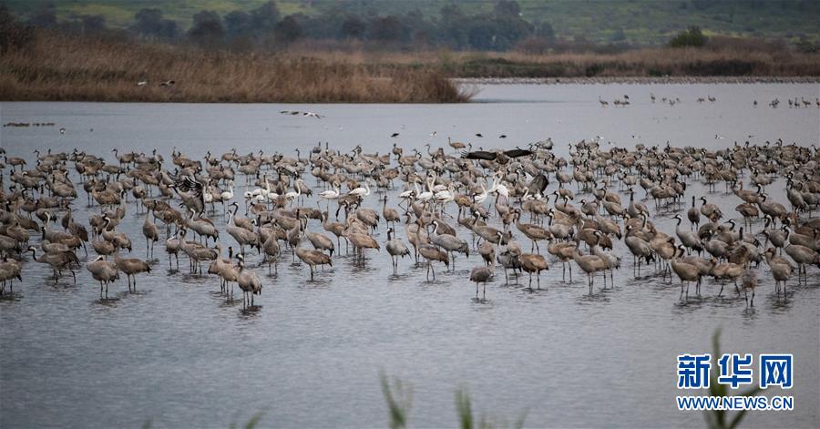 3月7日,在以色列阿格蒙胡拉鳥類和自然公園,一群火烈鳥(白色)和灰鶴在濕地里休息。新華社記者郭昱攝