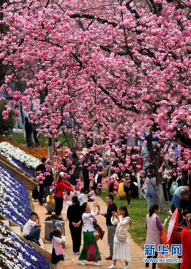 昆明櫻花盛開 游人紛至沓來