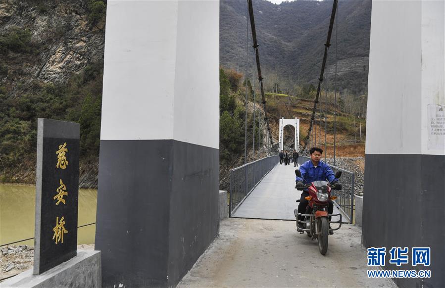 3月25日,略陽縣徐家坪鎮(zhèn)藥木院村村民騎著摩托車行駛在新修的鋼結(jié)構(gòu)吊橋上。 新華社記者陶明攝