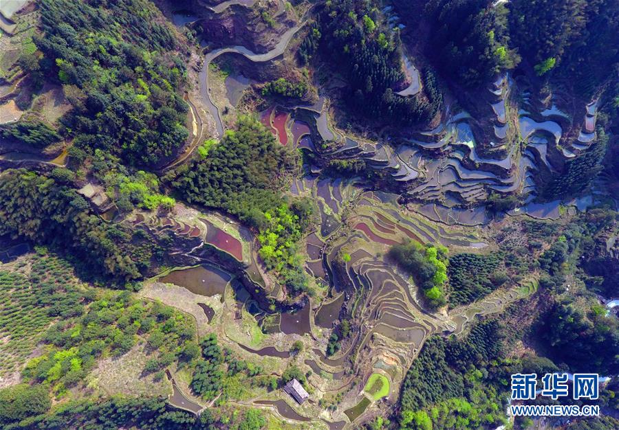這是3月29日無人機(jī)拍攝的廣西融水苗族自治縣桿洞鄉(xiāng)黨鳩村的田園春色。