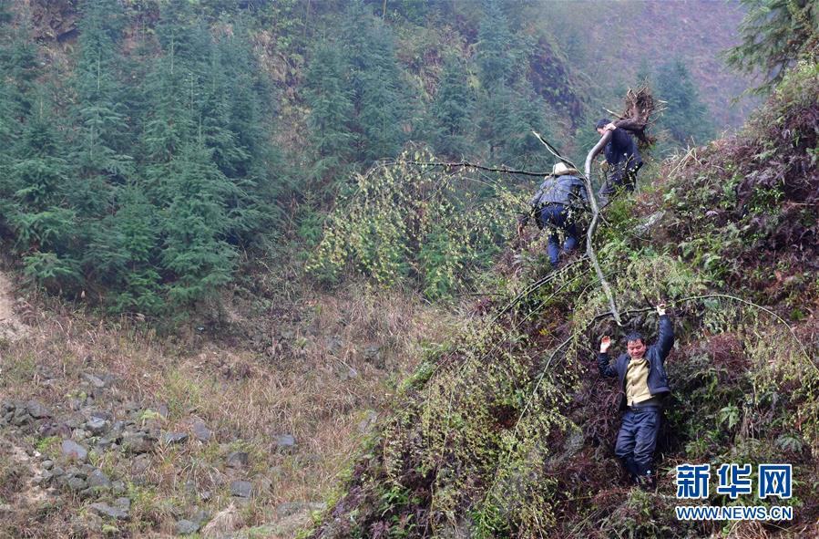這是黔桂烏英苗寨的群眾在山上抬樹苗,準(zhǔn)備用來美化居住環(huán)境(3月16日攝)。