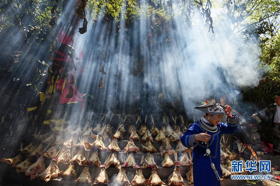 4月7日,苗族群眾在參加祭“巫耶”民俗活動(dòng)。4月6日至7日,在貴州省黔東南苗族侗族自治州劍河縣觀么鎮(zhèn)新民村和新合村,來(lái)自劍河縣和三穗縣的苗族同胞歡聚一堂,通過(guò)民族歌舞展演、非遺手工藝展示、千戶祭“巫耶”、跳蘆笙舞等形式,與來(lái)賓一起歡慶2019年高雍苗族“三月三”民俗文化節(jié)。 新華社記者 楊文斌 攝