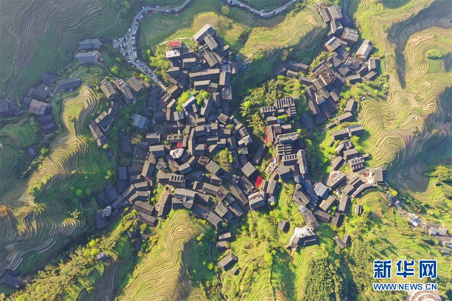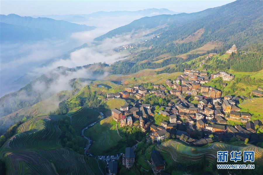 龍勝各族自治縣和平鄉(xiāng)平安村一景(4月7日無(wú)人機(jī)拍攝)。連日降雨過(guò)后,廣西龍勝各族自治縣和平鄉(xiāng)平安村的壯族村寨迎來(lái)久違的朝陽(yáng)。 新華社記者 曹祎銘 攝