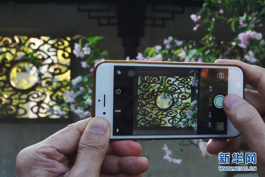 2019年4月1日,一名游客在中國蘇州耦園內拍照。2000年,耦園和滄浪亭、藝圃、獅子林、退思園作為蘇州古典園林的擴展項目被列入聯合國教科文組織世界文化遺產名單。 新華社記者杜涓涓攝