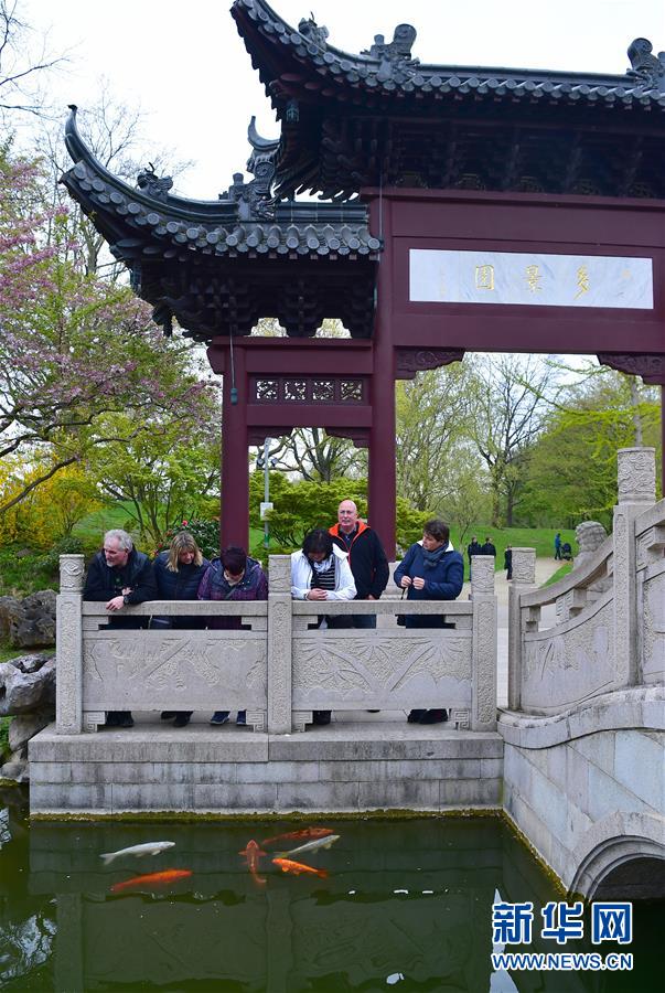 2019年4月13日,在德國曼海姆,游客在中式園林“多景園”內觀魚?!岸嗑皥@”位于曼海姆市路易森公園內,占地約6000平方米,建筑面積約1500平方米,是目前歐洲最為完整的中國古典園林建筑群落之一。 新華社記者逯陽攝