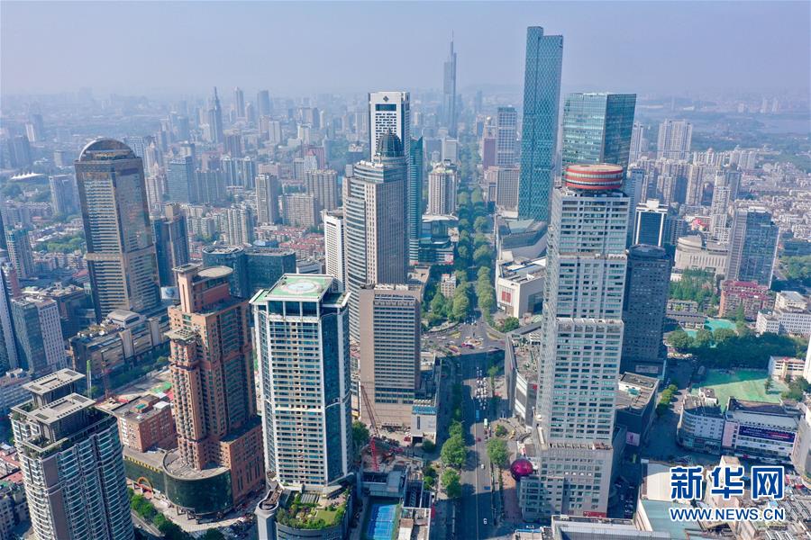 這是4月19日無(wú)人機(jī)拍攝的南京新街口。 新華社記者 李博 攝