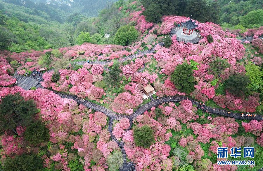4月25日,游客在龜峰山杜鵑花海中游玩(無人機拍攝)。 近日,湖北省麻城市龜峰山的10萬畝古杜鵑盛開,大量游客前來賞花觀景。 新華社記者 程敏 攝
