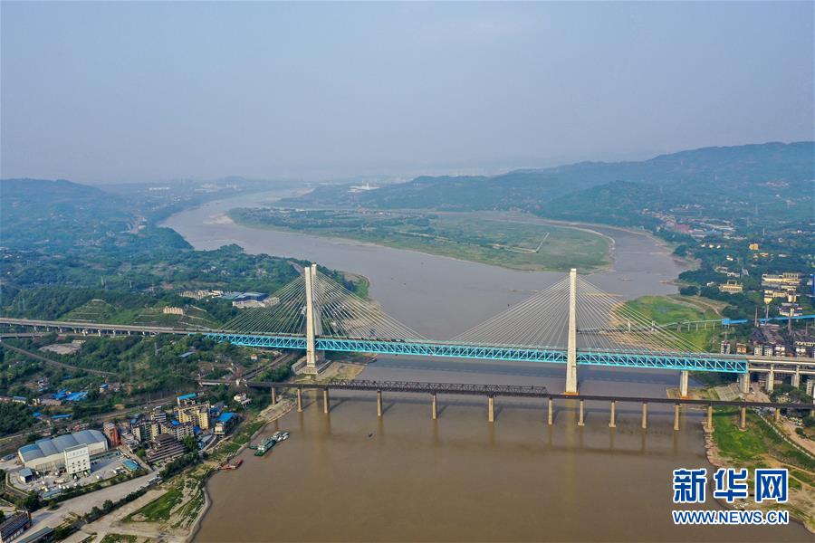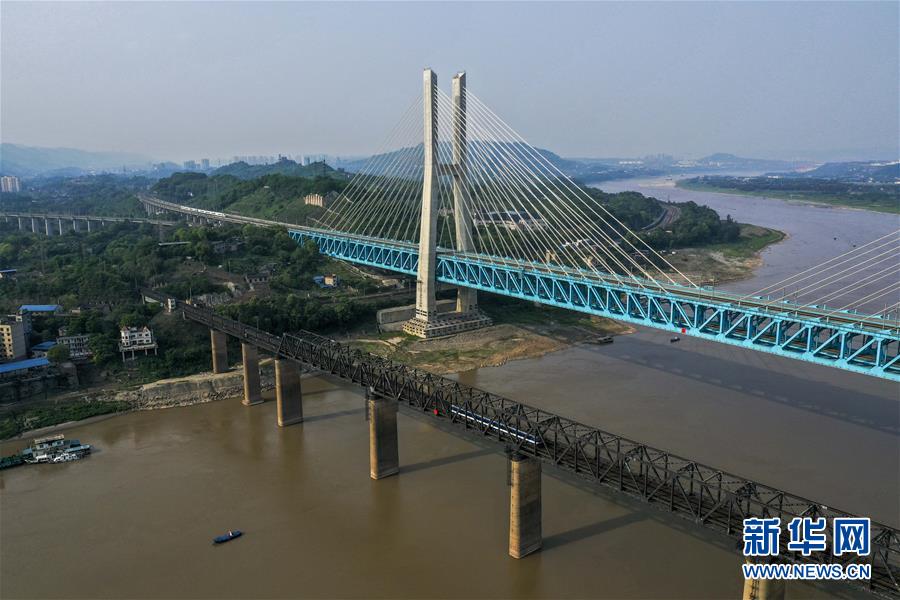 新白沙沱長(zhǎng)江特大橋在老橋下游100米左右位置跨越長(zhǎng)江,全長(zhǎng)約5.3公里,為上下兩層六線鐵路橋,上層為四線鐵路客運(yùn)專(zhuān)線,2018年1月25日隨著渝貴鐵路通車(chē)正式投入運(yùn)營(yíng)。該橋是渝貴鐵路全線規(guī)模最大、技術(shù)最為復(fù)雜的控制性工程,是世界上首座六線鐵路鋼桁梁斜拉橋,也是世界上每延米載荷量最大的橋梁,同時(shí)也是世界上首座雙層鐵路鋼桁梁斜拉橋。
