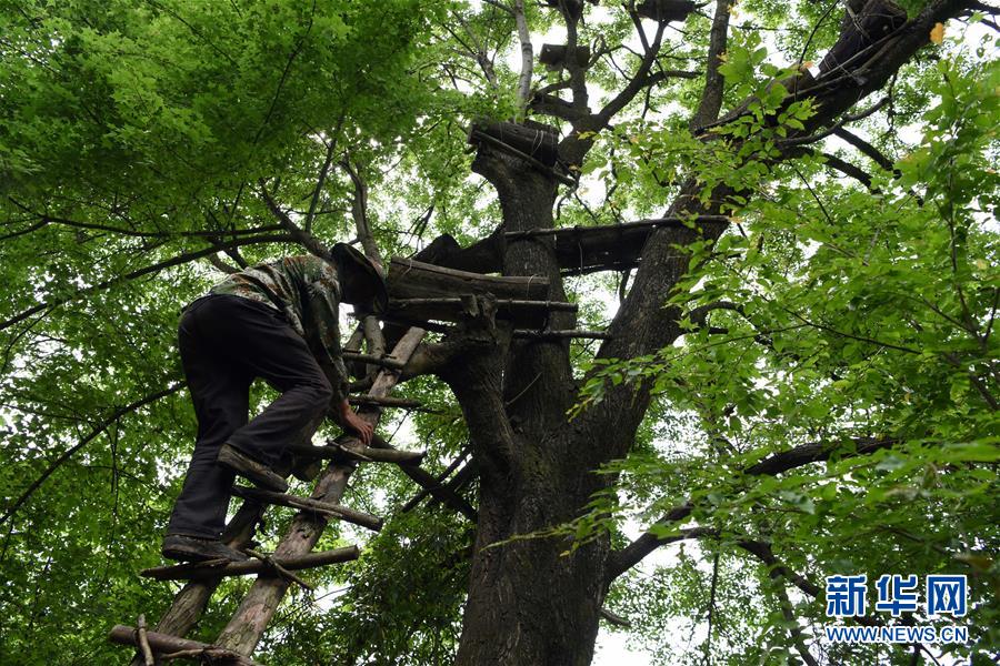5月10日,在甘肅省隴南市徽縣大河店鎮(zhèn)硬灣村,蜂農(nóng)劉輝林準備查看放在樹上的蜂箱情況。 甘肅省隴南市徽縣大河店鎮(zhèn)硬灣村位于秦巴山區(qū)深處,2017年,在當?shù)卣姆龀窒拢堁吕铣裁垧B(yǎng)殖農(nóng)民專業(yè)合作社成立,蜂農(nóng)們將傳統(tǒng)養(yǎng)蜂技藝和現(xiàn)代加工方式相結(jié)合,并通過電商等渠道打開銷路,有效帶動了當?shù)刎毨Т迕衩撠氈赂弧D壳罢麄€合作社共有蜂箱2000余個,每箱每年可帶來三四千元的收入。 新華社記者 馬寧 攝