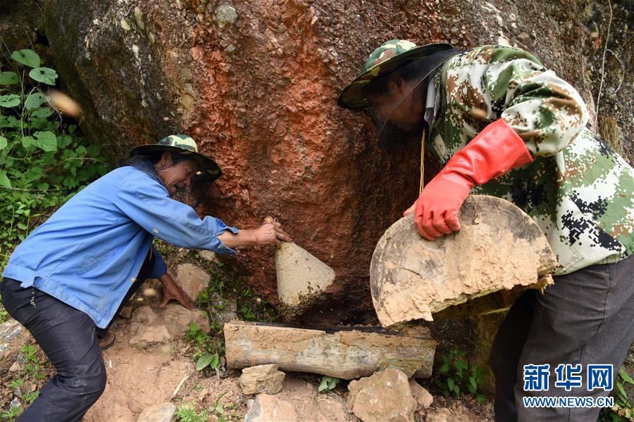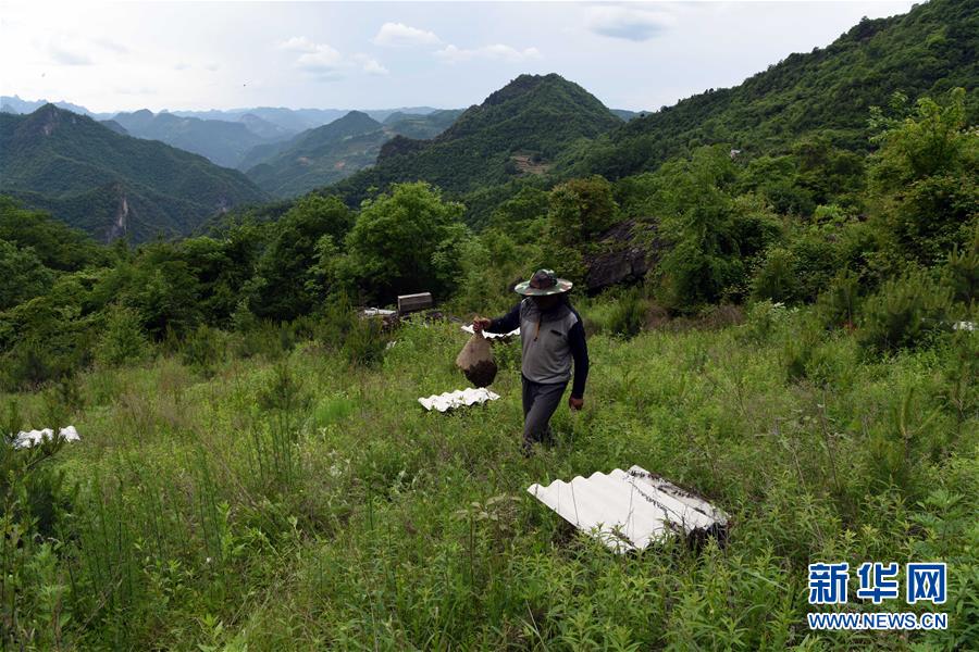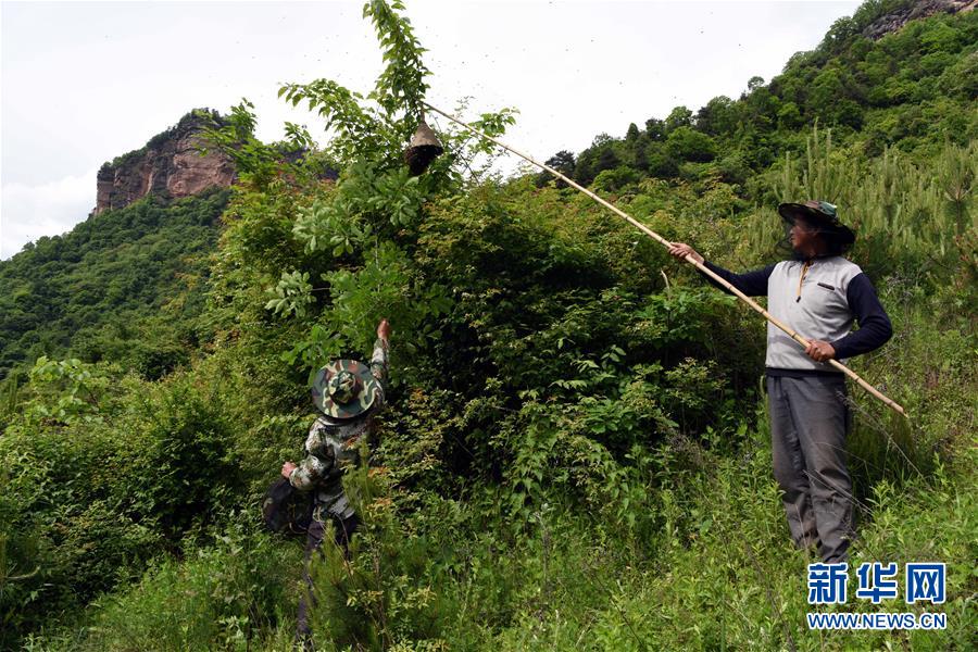 5月10日,在甘肅省隴南市徽縣大河店鎮(zhèn)硬灣村,蜂農(nóng)周仲頤(右)在收蜂。 甘肅省隴南市徽縣大河店鎮(zhèn)硬灣村位于秦巴山區(qū)深處,2017年,在當?shù)卣姆龀窒?,龍崖老巢蜜養(yǎng)殖農(nóng)民專業(yè)合作社成立,蜂農(nóng)們將傳統(tǒng)養(yǎng)蜂技藝和現(xiàn)代加工方式相結(jié)合,并通過電商等渠道打開銷路,有效帶動了當?shù)刎毨Т迕衩撠氈赂?。目前整個合作社共有蜂箱2000余個,每箱每年可帶來三四千元的收入。 新華社記者 馬寧 攝