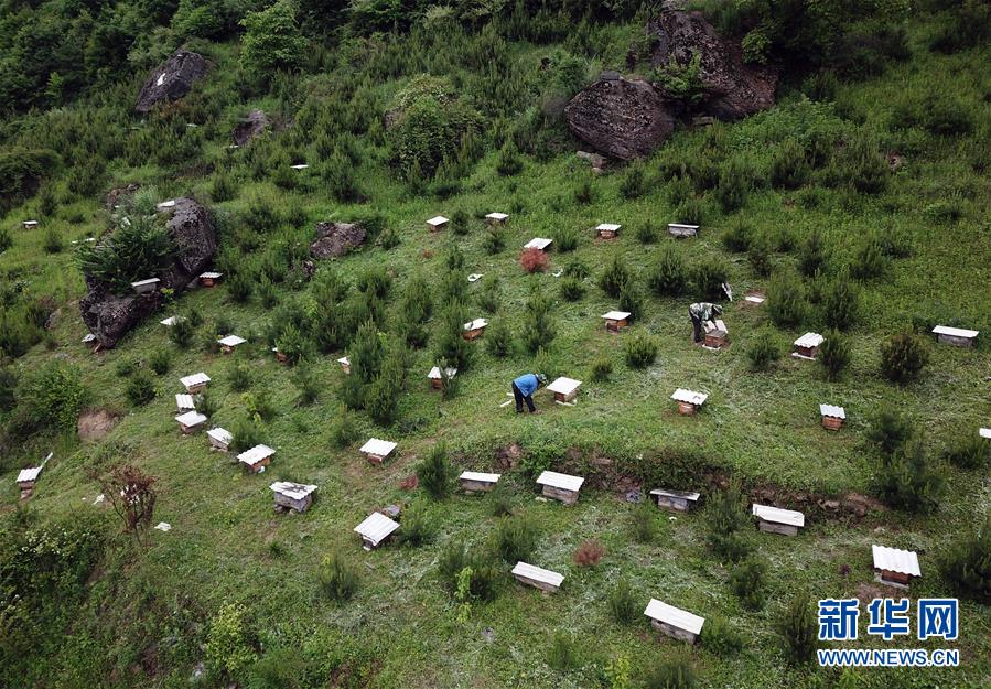 5月10日,在甘肅省隴南市徽縣大河店鎮(zhèn)硬灣村,蜂農(nóng)查看蜂箱情況(無人機拍攝)。 甘肅省隴南市徽縣大河店鎮(zhèn)硬灣村位于秦巴山區(qū)深處,2017年,在當?shù)卣姆龀窒拢堁吕铣裁垧B(yǎng)殖農(nóng)民專業(yè)合作社成立,蜂農(nóng)們將傳統(tǒng)養(yǎng)蜂技藝和現(xiàn)代加工方式相結(jié)合,并通過電商等渠道打開銷路,有效帶動了當?shù)刎毨Т迕衩撠氈赂弧D壳罢麄€合作社共有蜂箱2000余個,每箱每年可帶來三四千元的收入。 新華社記者 馬寧 攝
