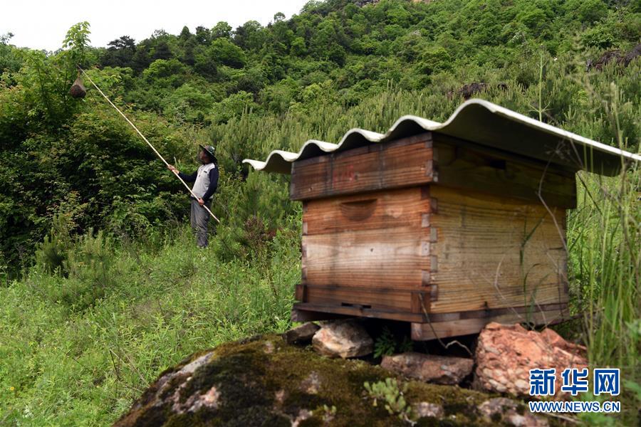 5月10日,在甘肅省隴南市徽縣大河店鎮(zhèn)硬灣村,蜂農(nóng)周仲頤在收蜂。 甘肅省隴南市徽縣大河店鎮(zhèn)硬灣村位于秦巴山區(qū)深處,2017年,在當?shù)卣姆龀窒?,龍崖老巢蜜養(yǎng)殖農(nóng)民專業(yè)合作社成立,蜂農(nóng)們將傳統(tǒng)養(yǎng)蜂技藝和現(xiàn)代加工方式相結(jié)合,并通過電商等渠道打開銷路,有效帶動了當?shù)刎毨Т迕衩撠氈赂?。目前整個合作社共有蜂箱2000余個,每箱每年可帶來三四千元的收入。 新華社記者 馬寧 攝