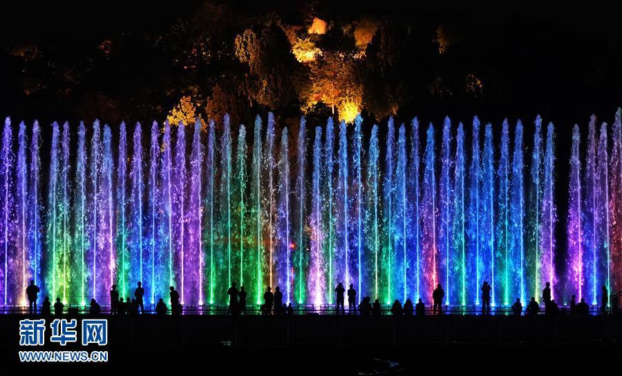 5月14日,游客在奧林匹克森林公園觀看水幕燈光秀。 當(dāng)晚,一場“空間光影秀”在北京上演。 新華社記者 鞠煥宗 攝