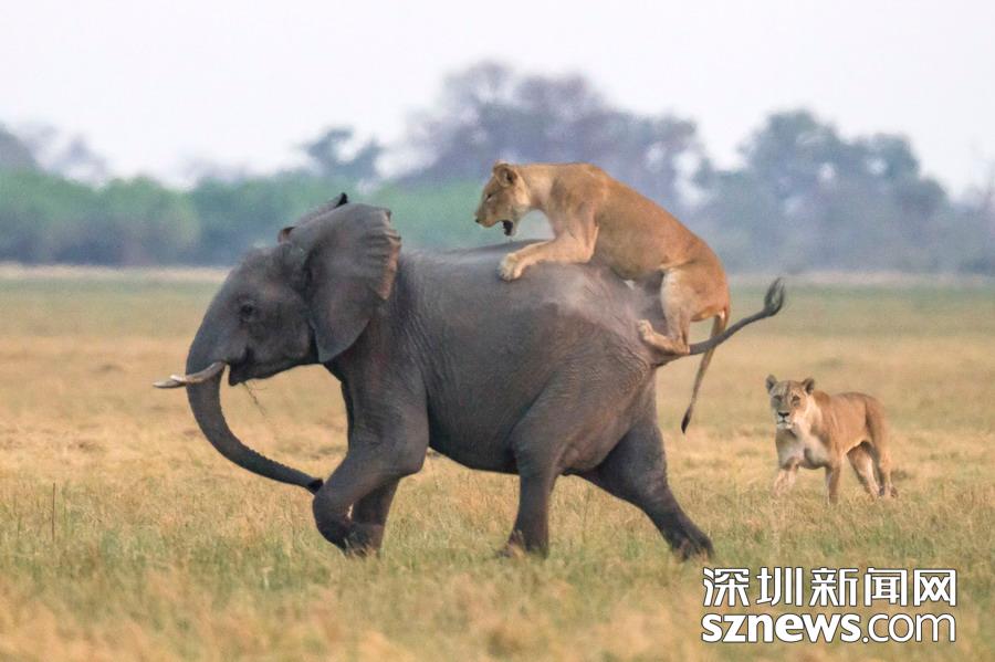 英國攝影師詹姆斯(James Gifford)在博茨瓦納喬貝國家公園拍到一群獅子獵食大象的精彩畫面。在詹姆斯的鏡頭下,一頭母獅跳到了一頭小象的背上想要將其拿下,但僅憑一己之力又不能做到。但當(dāng)母獅的后援抵達(dá)時,象群也趕到了現(xiàn)場。最終,小象回到了象群中獲得庇護(hù),而獅群也不得不悻悻離去。