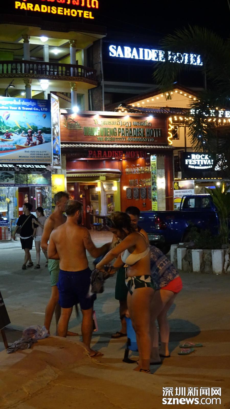 萬榮的開放程度很高。夜晚,南松河畔、街道兩旁都是酒吧,常??梢钥吹狡骰貋砩碇狙b的“老外”當街站立。李仁奇 攝