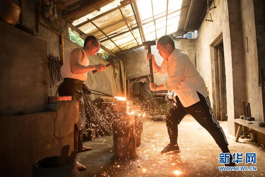 5月21日,鄭國榮和兒子鄭劍威在“古越劍鋪”對(duì)坯料進(jìn)行鍛打。 鄭國榮,1964年生于浙江龍泉,已經(jīng)跟寶劍打了30多年的交道。1982年他作為學(xué)徒進(jìn)入龍泉市寶劍廠,1994年劍廠改制后,成立了工作室“古越劍鋪”,開始獨(dú)立的鑄劍生涯。 從兵器到精神的象征,鄭國榮一直對(duì)寶劍懷有敬畏之心。在他的工作室,一把寶劍,從理念形成、圖紙?jiān)O(shè)計(jì)、備料到制作整合一般需要兩三個(gè)月。自劍鋪成立以來,他已帶了20多個(gè)徒弟,如今都成了有名的鑄劍師。他的兒子也在畢業(yè)后跟隨他鑄劍,目前已基本掌握了全流程的鑄造技藝。 新華社記者翁忻旸攝