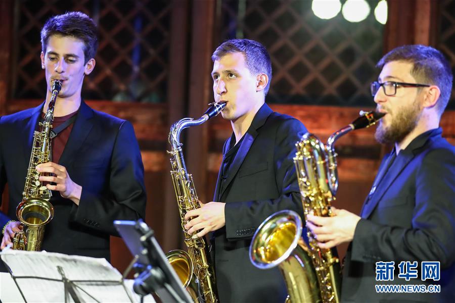 5月26日,凱比亞特樂隊(duì)成員在音樂會(huì)上表演。 當(dāng)日,作為第十九屆“相約北京”藝術(shù)節(jié)系列演出之一,西班牙凱比亞特樂隊(duì)薩克斯四重奏音樂會(huì)在北京Temple東景緣上演。 新華社記者 張玉薇 攝