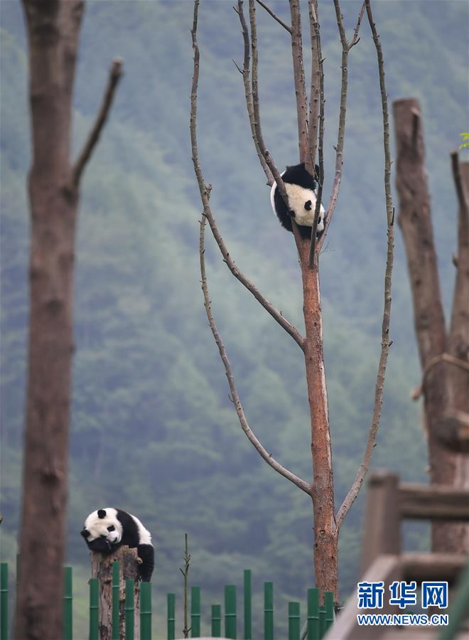 5月25日在中國大熊貓保護研究中心臥龍神樹坪基地的“熊貓幼兒園”內(nèi)拍攝的大熊貓。