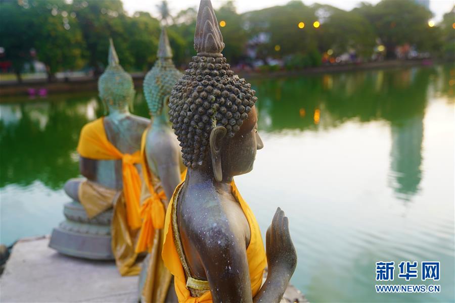 這是夕陽下的斯里蘭卡科倫坡水中廟佛像(5月27日攝)。 在科倫坡貝拉湖上有一座木造樓閣——水中廟。木造建筑上面覆蓋著藍(lán)瓦,外圍環(huán)繞著線條優(yōu)美的佛像。樓閣外高臺上供奉的佛像,與不遠(yuǎn)處的高層建筑相互映照。祥和寧靜的水中廟已成為人們修心、祈福的重要場所。 新華社記者唐璐攝