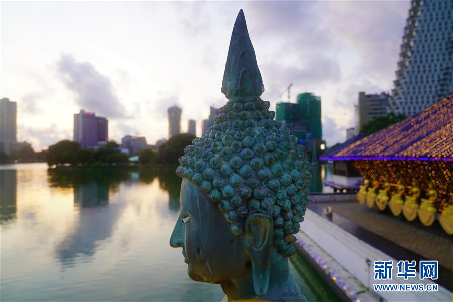 這是夕陽下的斯里蘭卡科倫坡水中廟佛像(5月27日攝)。 在科倫坡貝拉湖上有一座木造樓閣——水中廟。木造建筑上面覆蓋著藍(lán)瓦,外圍環(huán)繞著線條優(yōu)美的佛像。樓閣外高臺上供奉的佛像,與不遠(yuǎn)處的高層建筑相互映照。祥和寧靜的水中廟已成為人們修心、祈福的重要場所。 新華社記者唐璐攝