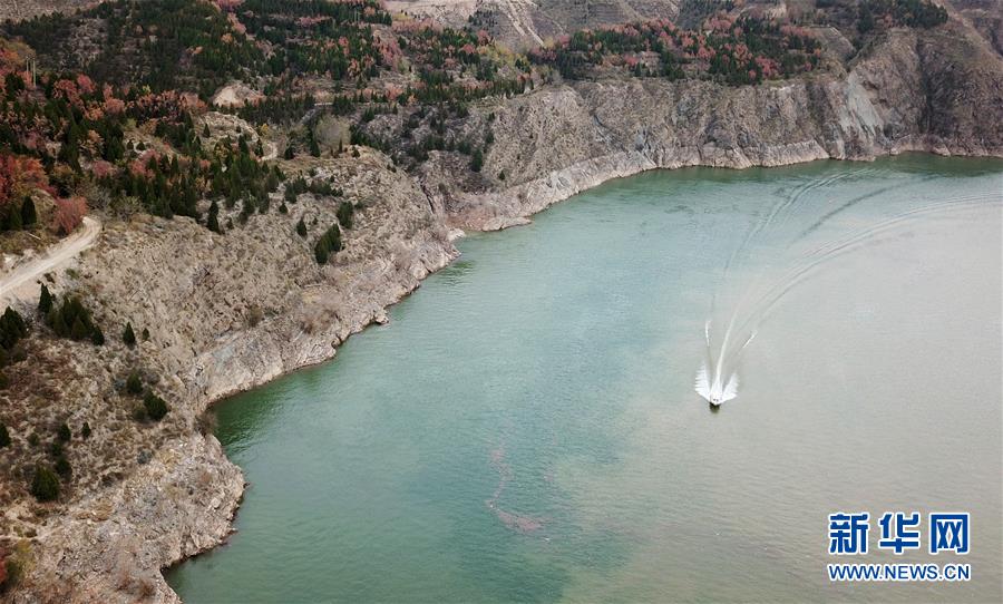 10月24日,一艘快艇從劉家峽水庫庫區(qū)駛過(無人機(jī)拍攝)。  新華社記者 陳斌 攝