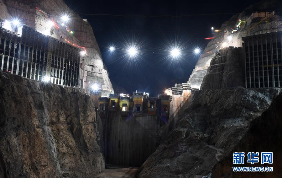 這是正在緊張施工的烏東德水電站大壩主體工程夜景(5月31日攝)。 新華社記者陳曄華攝