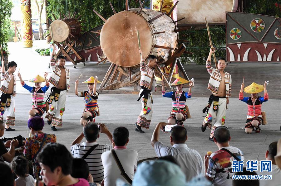 基諾族演員在表演大鼓舞(6月1日攝)。 在云南省西雙版納傣族自治州景洪市基諾山基諾族鄉(xiāng)的基諾族村寨,每天的基諾大鼓舞表演吸引了眾多游客前來觀賞體驗(yàn),帶動(dòng)了基諾族群眾就業(yè)和增收。基諾族大鼓舞蘊(yùn)涵豐富的歷史文化內(nèi)涵,已被列入國家級非物質(zhì)文化遺產(chǎn)保護(hù)名錄。 新華社記者 楊宗友 攝