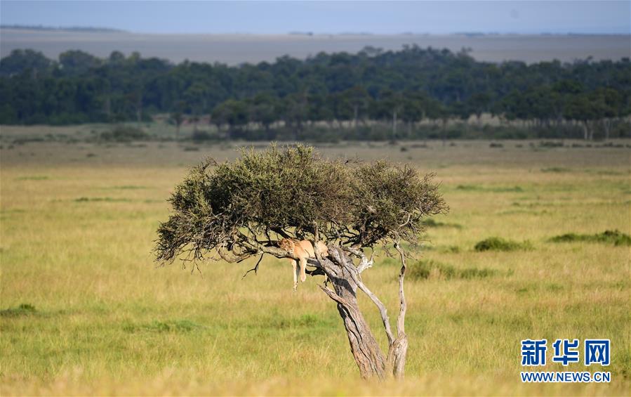 6月17日,在肯尼亞馬賽馬拉國家保護(hù)區(qū),一頭獅子在樹上休息。 新華社記者 李琰 攝