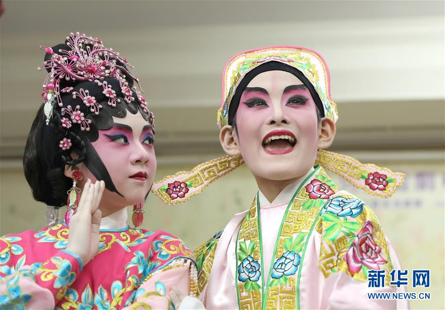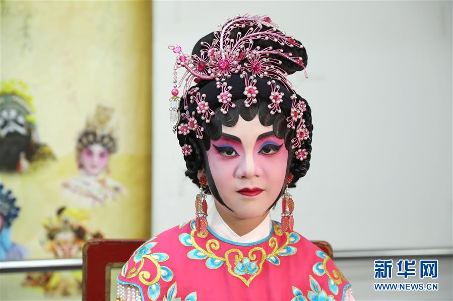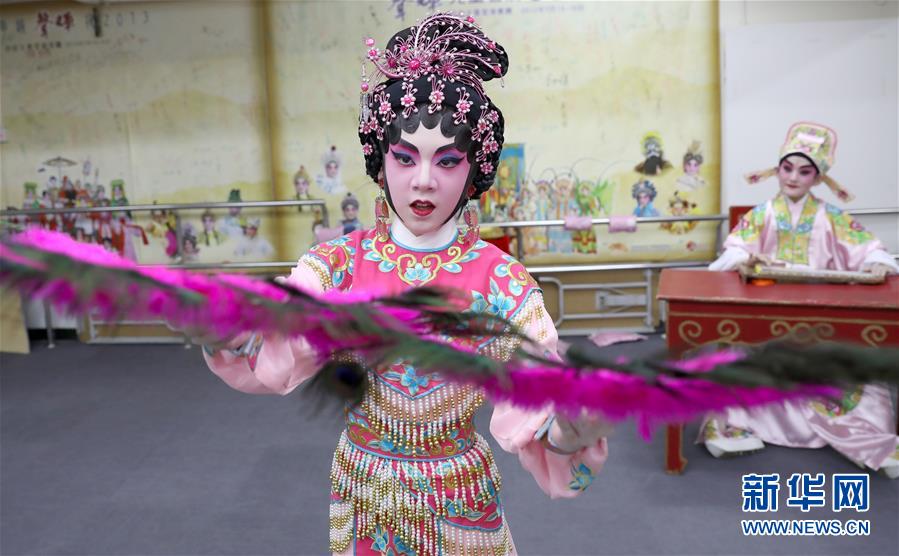 粵劇小演員陸瑞徽在準備折子戲《艷曲醉周郎》的表演(6月8日攝)。 聲輝粵劇推廣協(xié)會成立于2003年,是香港重要粵劇藝術團體之一,致力于向青少年推廣粵劇。協(xié)會目前有兩個初班,3個中班,一個青少年班?;泟∮址Q“廣東大戲”,表演技藝包括“唱做念打”,即唱功、身段、臺詞、武打,主要流行于廣東、廣西和香港、澳門等地區(qū)。2009年,粵劇被列入聯(lián)合國教科文組織人類非物質(zhì)文化遺產(chǎn)代表作名錄,今年正逢十周年。 新華社記者 吳曉初 攝