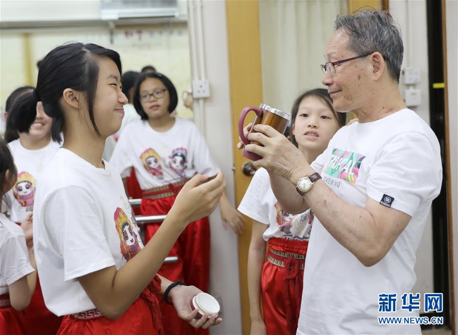 一群孩子和79歲的粵劇名伶楊劍華在一起(6月8日攝)。 聲輝粵劇推廣協(xié)會成立于2003年,是香港重要粵劇藝術團體之一,致力于向青少年推廣粵劇。協(xié)會目前有兩個初班,3個中班,一個青少年班?;泟∮址Q“廣東大戲”,表演技藝包括“唱做念打”,即唱功、身段、臺詞、武打,主要流行于廣東、廣西和香港、澳門等地區(qū)。2009年,粵劇被列入聯(lián)合國教科文組織人類非物質(zhì)文化遺產(chǎn)代表作名錄,今年正逢十周年。 新華社記者 吳曉初 攝