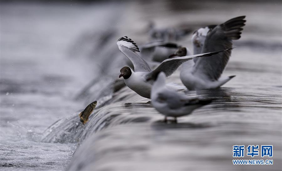 7月6日,在青海省剛察縣沙柳河里,幾只棕頭鷗在等待捕捉躍起的湟魚。 新華社記者 費(fèi)茂華攝