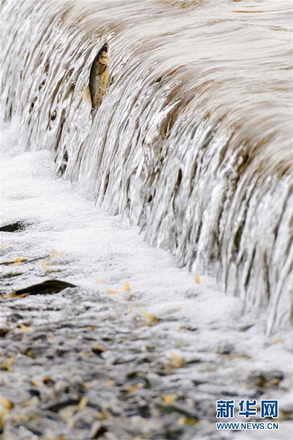 7月6日,在青海省剛察縣沙柳河里,一只湟魚(yú)躍起向上洄游。 新華社記者 劉金海攝