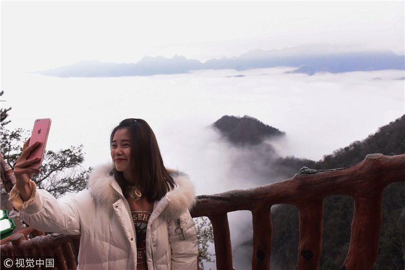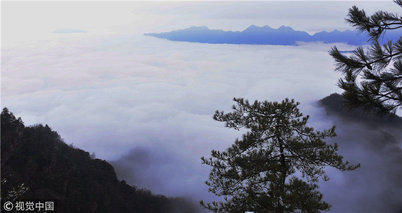 2019年3月3日,陜西商洛,位于鎮(zhèn)安縣的塔云山景區(qū)云海翻騰,宛如仙境。袁景智/視覺中國(guó) 編輯/陳進(jìn)