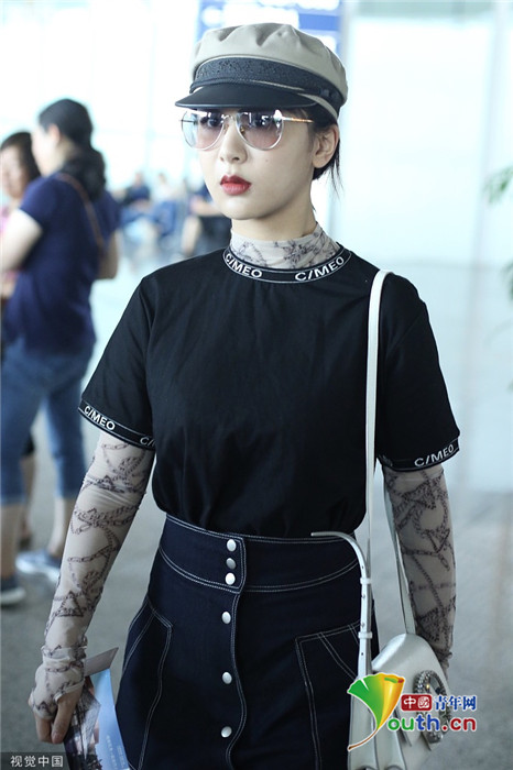 2019年7月25日,北京,楊紫現(xiàn)身機(jī)場。她穿黑色短T配牛仔裙變時髦女郎,戴報童帽架墨鏡”港風(fēng)女sir“即視感,人氣爆棚。