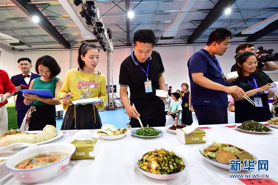 8月3日,在鄉(xiāng)村美食文化大賽現(xiàn)場,評(píng)委在對(duì)菜品進(jìn)行評(píng)定。新華社記者馮大鵬攝