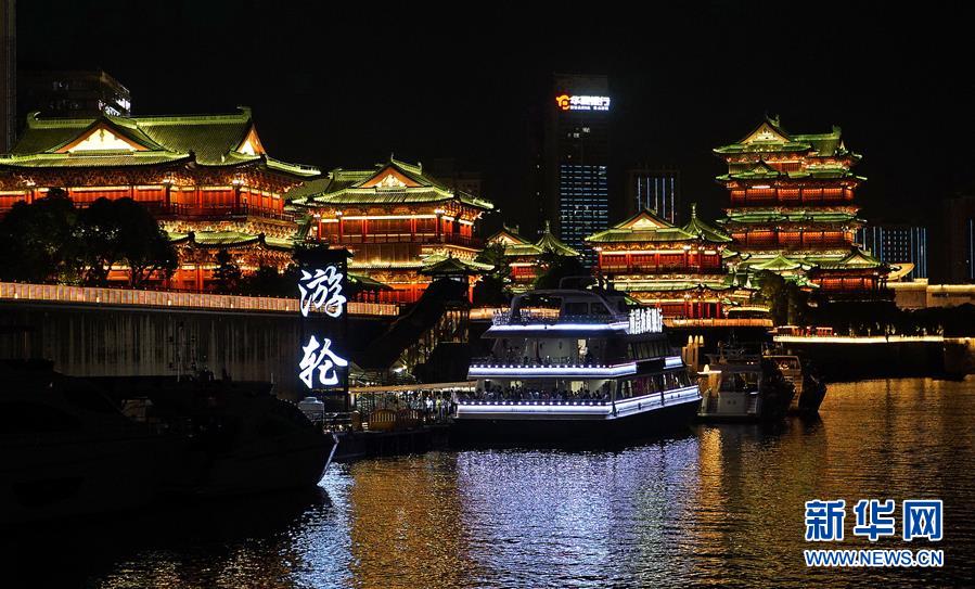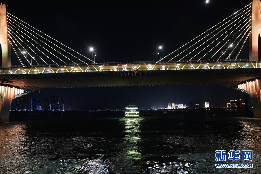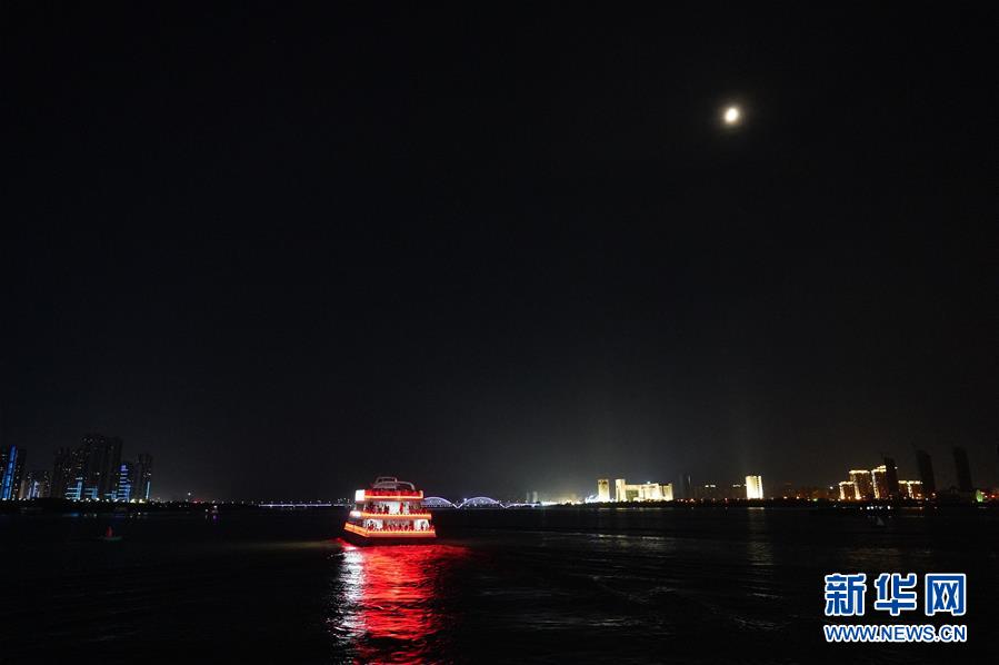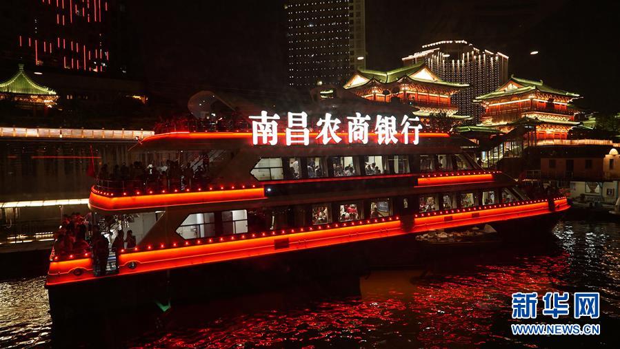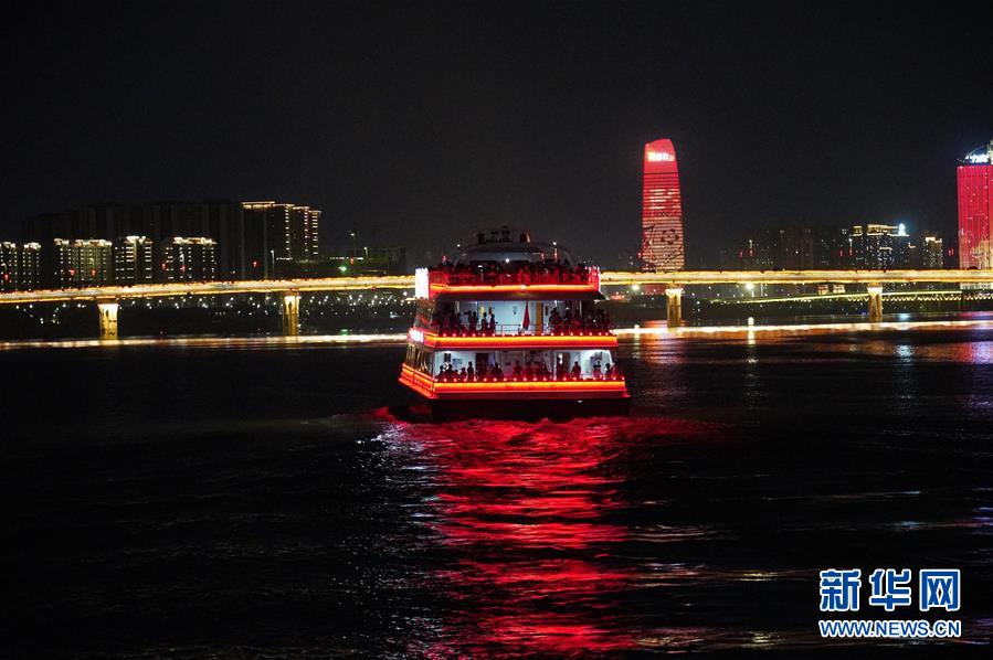 在江西南昌,游客在游輪上觀賞夜景風光(8月6日攝)。 新華社記者萬象 攝