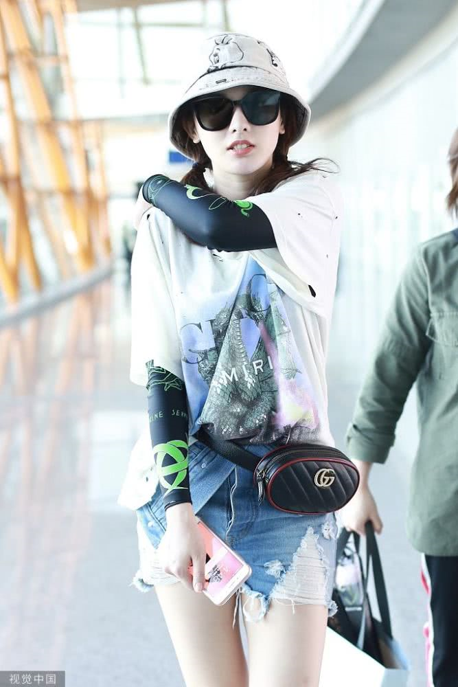 內(nèi)地女星彭小苒現(xiàn)身機場,穿印花T恤牛仔短褲,白色馬丁靴很時髦