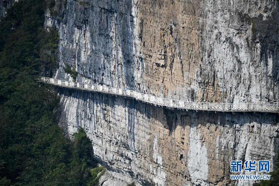 游客在重慶金佛山風(fēng)景區(qū)內(nèi)的絕壁棧道上游覽體驗(8月20日攝)。 新華社記者 劉潺 攝