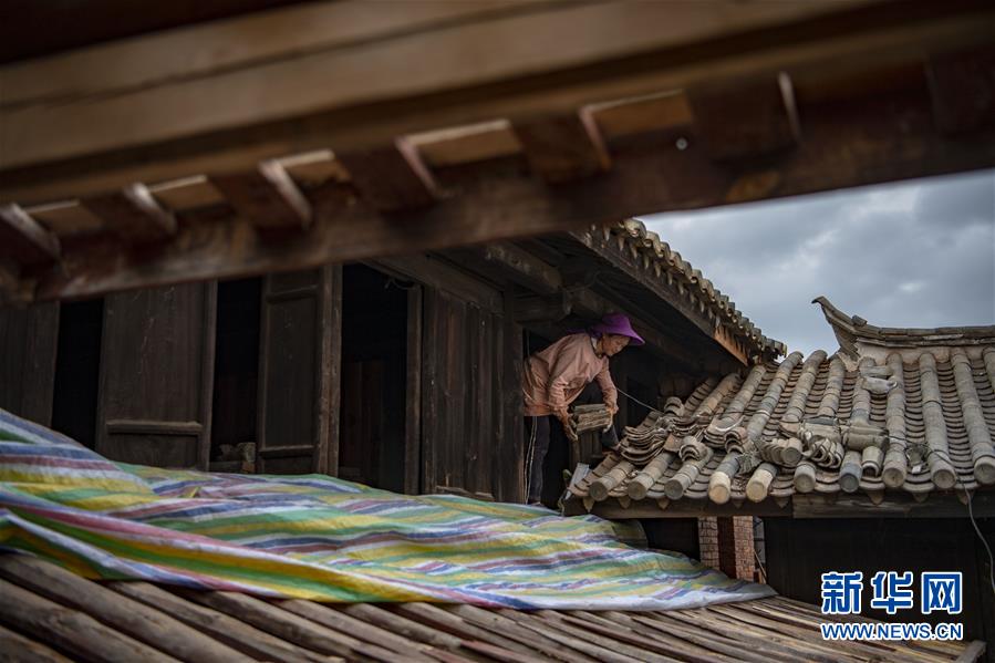 在石屏縣異龍鎮(zhèn)符家營村211號民居,工人王艷華在修繕屋頂(8月8日攝)。新華社記者 江文耀 攝
