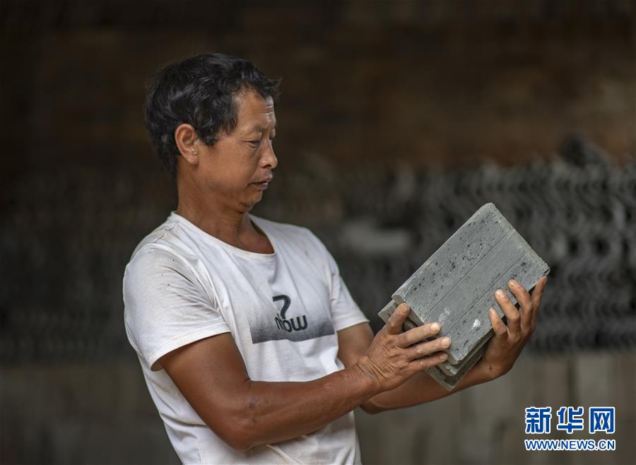 石屏縣異龍鎮(zhèn)符家營村村支書楊松在挑選準(zhǔn)備用于修繕老屋的地磚(8月8日攝)。新華社記者 江文耀 攝