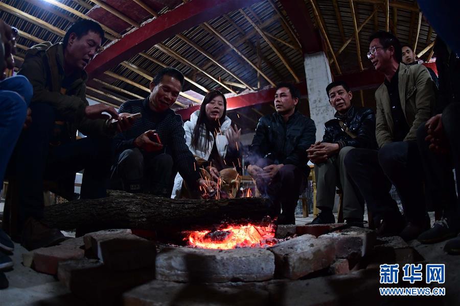 龍革雄(左二)和回家開(kāi)辦農(nóng)家樂(lè)的村民商量相關(guān)事宜(2017年2月25日攝)。 新華社記者 黃孝邦 攝