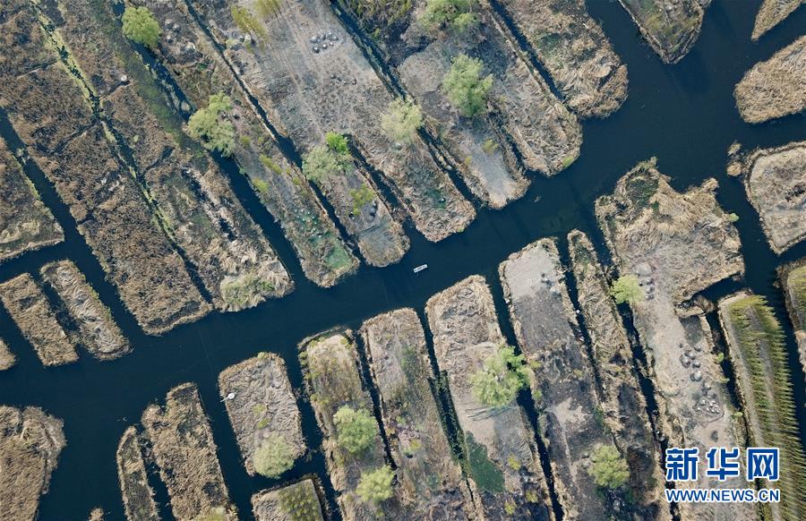游船在白洋淀內(nèi)行駛(4月10日無(wú)人機(jī)拍攝)。新華社記者牟宇攝