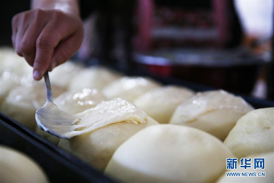 8月29日,付艷梅為發(fā)酵好的面包團抹奶酪。新華社記者淡航攝