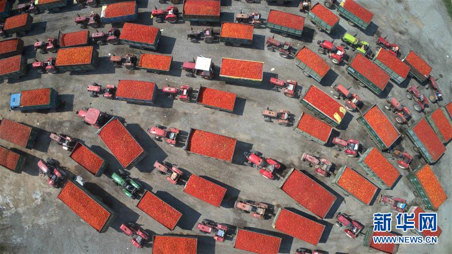 9月4日無人機拍攝的河套灌區(qū)三道橋鎮(zhèn)農(nóng)民向本地蔬菜加工廠排隊出售番茄。 新華社記者 劉詩平 攝