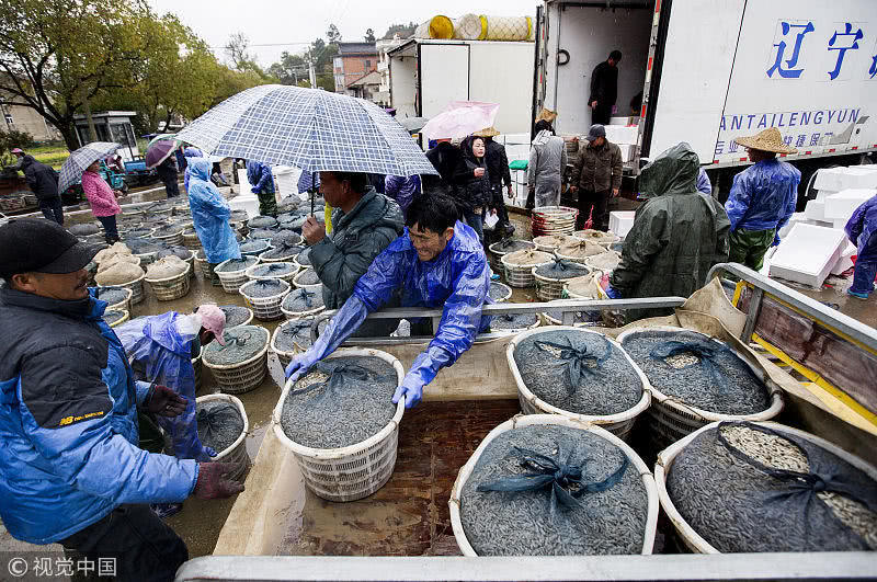 浙江臺(tái)州,三門縣花橋鎮(zhèn)柵下村的文化禮堂前,村民們冒雨和商販交易蟶苗,現(xiàn)場(chǎng)一片繁忙。據(jù)了解,花橋蟶苗屬于野生苗,存活率高,易成長(zhǎng),極受市場(chǎng)歡迎,一到捕撈季節(jié),遼寧、山東、江蘇和浙江的養(yǎng)殖戶和蟶苗小販爭(zhēng)相到花橋購(gòu)買優(yōu)質(zhì)蟶苗。