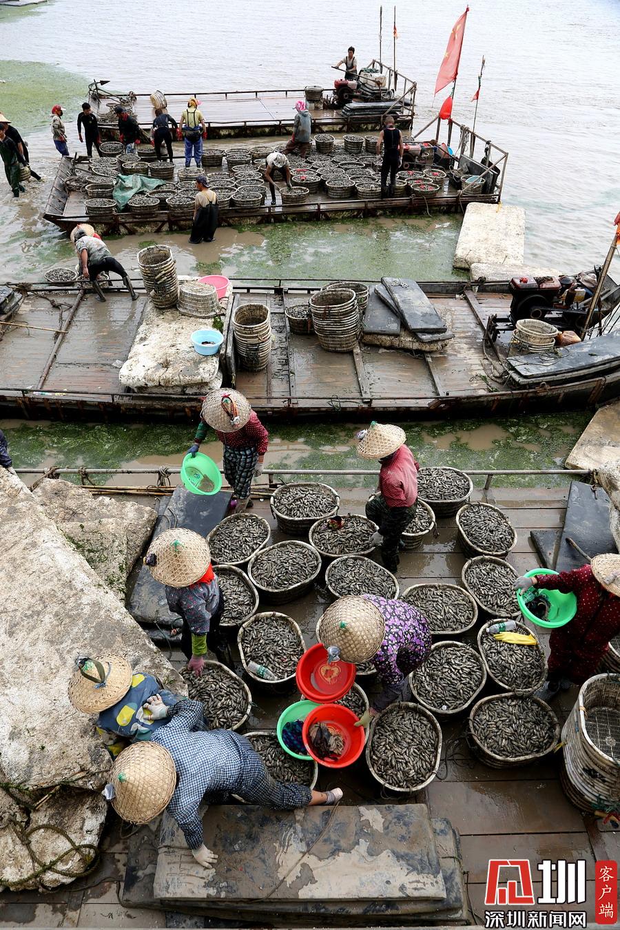 村民們冒雨和商販交易蟶苗,現(xiàn)場(chǎng)一片繁忙。
