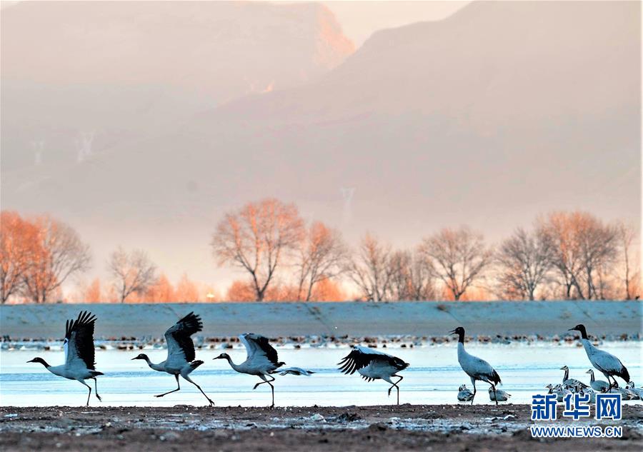 西藏拉薩市林周縣境內的黑頸鶴(2017年1月16日攝)。新華社記者張汝鋒攝