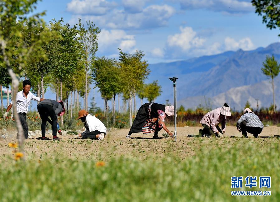 當(dāng)?shù)厝罕娫谏侥鲜性铱h藏草萬(wàn)畝植物種苗繁育基地勞動(dòng)(8月29日攝)。 新華社記者 張汝鋒 攝