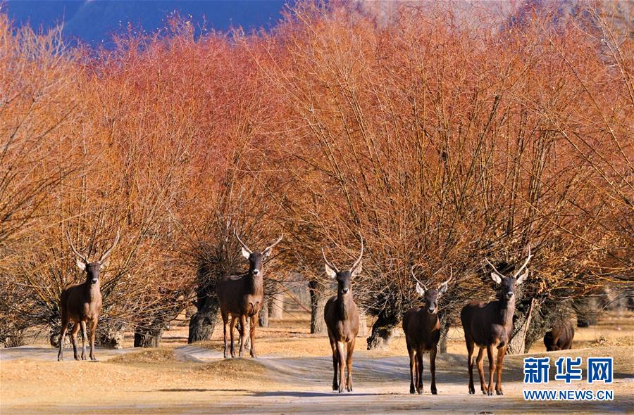 馬鹿棲息在位于雅魯藏布江岸邊的山南市乃東區(qū)澤當(dāng)鎮(zhèn)的萬(wàn)畝人工防護(hù)林里(2018年1月6日攝)。新華社記者 張汝鋒 攝