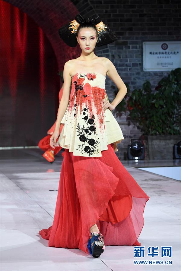 9月25日,模特在榮昌夏布·張義超非遺時尚大秀上展示時裝設(shè)計師張義超的時裝作品。